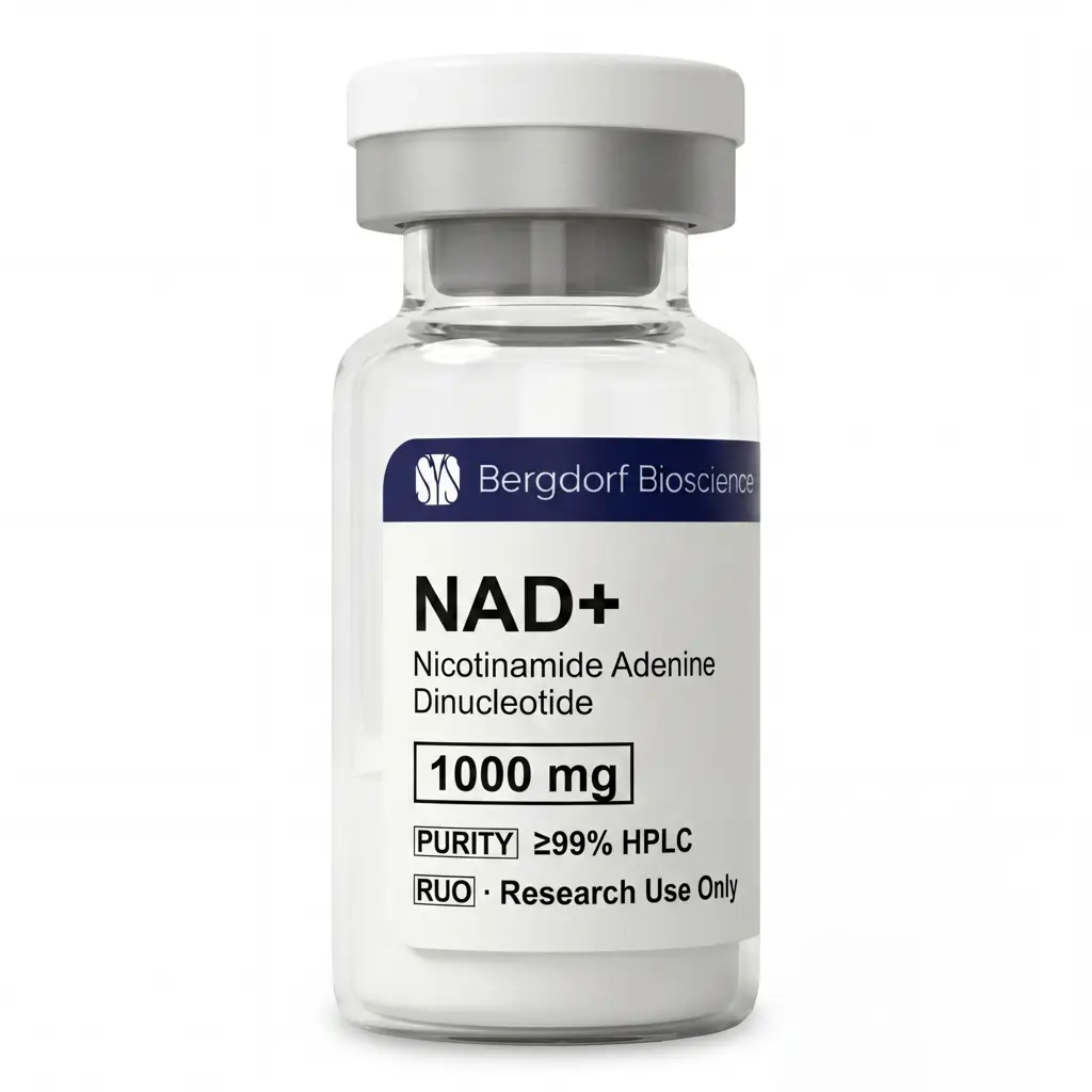 Premium NAD+ (Nicotinamide Adenine Dinucleotide) for Research NAD+ is the central redox coenzyme for cellular energy metabolism and the primary substrate for sirtuins (SIRT1-7), PARP1 DNA-repair enzymes, and CD38. Supplied as high-purity lyophilized powder (≥99% HPLC) in 1000mg vials for extended research use and stable storage.